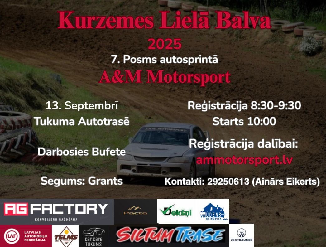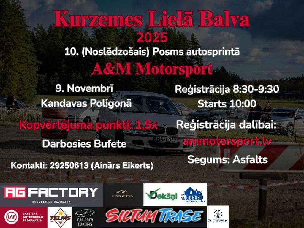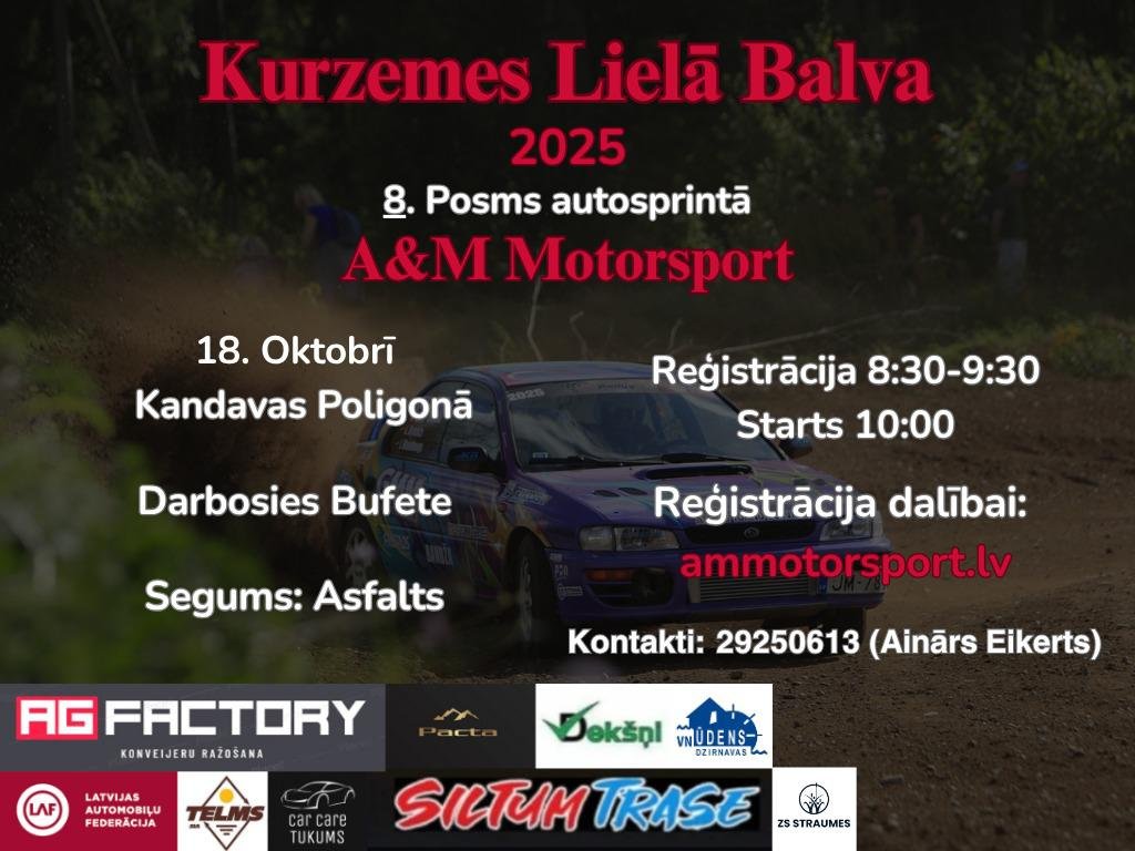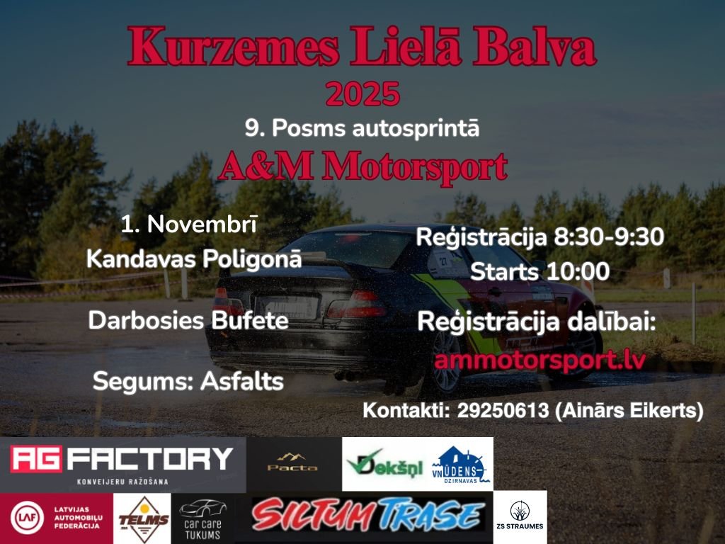 A&M Motorsport Kurzemes Lielā Balva! 10. posms autosprintā Kandavas Poligonā 09.11.2025 Starts 10:00 Reģistrācija Nolikums A&M Motorsport Kurzemes Lielā Balva! 9. posms autosprintā Kandavas Poligonā 01.11.2025 Starts 10:00 A&M Motorsport Kurzemes Lielā Balva! 8. posms autosprintā Kandavas Poligonā 18.10.2025 Starts 10:00 A&M Motorsport Kurzemes Lielā Balva! 7. posms autosprintā Tukuma autotrasē! 13.09.2025 Starts 10:00 A&M Motorsport Kurzemes Lielā Balva! 6. posms autosprintā Tukuma autotrasē! 23.08.2025 Starts 10:00 A&M Motorsport Kurzemes Lielā Balva! 5. posms Vecpils autotrasē! 12.07.2025 Starts 10:00 A&M Motorsport Kurzemes Lielā Balva! 4. posms autosprintā Tukuma autotrasē! 22.06.2025 Starts 10:00 A&M Motorsport Kurzemes Lielā Balva! 3. posms autosprintā Tukuma autotrasē! 07.06.2025 Starts 10:00 A&M Motorsport Kurzemes Lielā Balva! 2. Posms “KANDAVA” 03.05.2025 Starts 10:00 A&M Motorsport kauss autosprintā “KANDAVA” 05.04.2025 Starts 10:00 A&M Motorsport Kurzemes Lielā Balva! 1. posms Tukuma autotrasē. 12.01.2025 Starts 10:00 A&M Motorsport Kurzemes Lielā Balva! 10. posms autosprintā Kandavas auto poligonā! 19.10.2024 Starts 10:00 A&M Motorsport Kurzemes Lielā Balva! 9. posms autosprintā Kandavas auto poligonā! 28.09.2024 Starts 10:00 A&M Motorsport Kurzemes Lielā Balva! 8. posms Tukuma autotrasē. 08.09.2024 Starts 10:00 A&M Motorsport Kurzemes Lielā Balva! 7. posms Vecpils autotrasē. 04.08.2024 Starts 10:00 A&M Motorsport Kurzemes Lielā Balva! 6. posms Tukuma autotrasē. 07.07.2024 Starts 10:00 A&M Motorsport Kurzemes Lielā Balva! 5. posms Tukuma autotrasē. 01.06.2024 Starts 10:00 A&M Motorsport Kurzemes Lielā Balva!!! 11.05.20244. posms Tukuma autotrasē.Starts 10:00 A&M Motorsport Kurzemes Lielā Balva!!! 13.04.20243. posms Kandava.Starts 10:00 A&M Motorsport kauss autosprintā “KANDAVA” 30.03.2024 Starts 10:00 A&M Motorsport Kurzemes Lielā Balva!!! 11.02.20242. posms Tukuma trasē.Starts 10:00 A&M Motorsport Kurzemes Lielā Balva!!! 27.01.20241 posms Tukuma trasē.Starts 10:00 AG Factory kauss autosprintā! Tukuma trasē 16.12.2023Starts 10:00