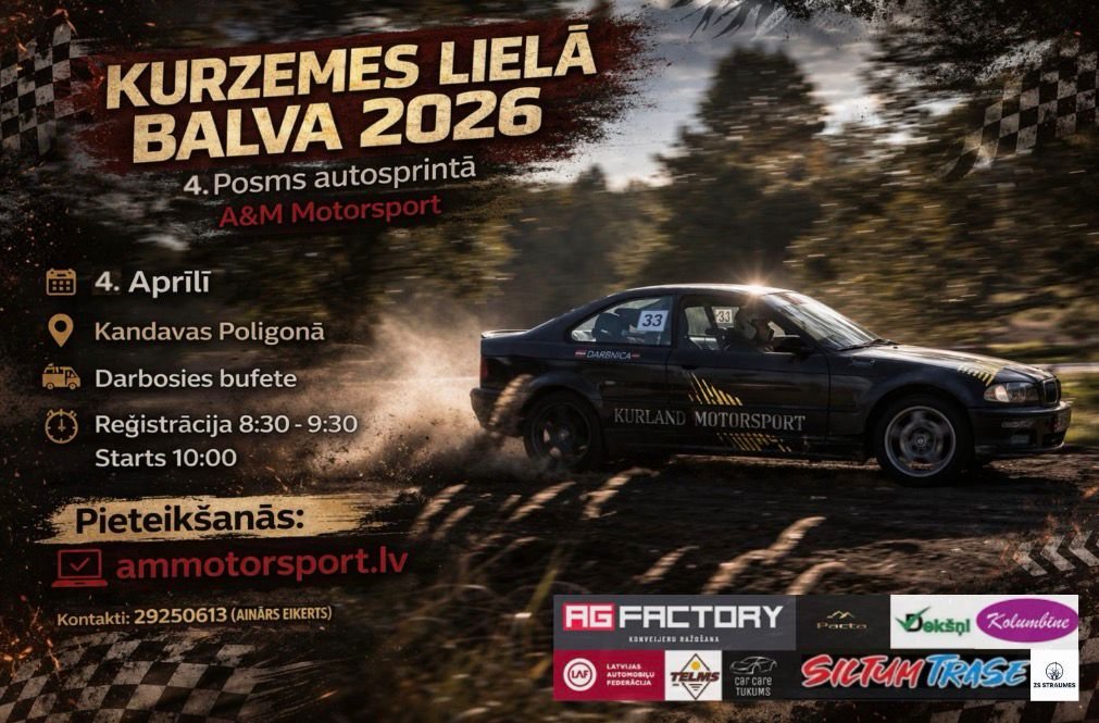A&M Motorsport Kurzemes Lielā Balva! 4. posms autosprintā Kandavas Poligonā 04.04.2026 Starts 10:00 Reģistrācija Nolikums A&M Motorsport Kurzemes Lielā Balva! 3. posms autosprintā Tukuma autotrasē! 15.02.2026 Starts 10:00 A&M Motorsport Kurzemes Lielā Balva! 2. posms autosprintā Tukuma autotrasē! 25.01.2026 Starts 10:00 A&M Motorsport Kurzemes Lielā Balva! 1. posms autosprintā Tukuma autotrasē! 11.01.2026 Starts 10:00 A&M Motorsport Kurzemes Lielā Balva! 10. posms autosprintā Kandavas Poligonā 09.11.2025 Starts 10:00 A&M Motorsport Kurzemes Lielā Balva! 9. posms autosprintā Kandavas Poligonā 01.11.2025 Starts 10:00 A&M Motorsport Kurzemes Lielā Balva! 8. posms autosprintā Kandavas Poligonā 18.10.2025 Starts 10:00 A&M Motorsport Kurzemes Lielā Balva! 7. posms autosprintā Tukuma autotrasē! 13.09.2025 Starts 10:00 A&M Motorsport Kurzemes Lielā Balva! 6. posms autosprintā Tukuma autotrasē! 23.08.2025 Starts 10:00 A&M Motorsport Kurzemes Lielā Balva! 5. posms Vecpils autotrasē! 12.07.2025 Starts 10:00 A&M Motorsport Kurzemes Lielā Balva! 4. posms autosprintā Tukuma autotrasē! 22.06.2025 Starts 10:00 A&M Motorsport Kurzemes Lielā Balva! 3. posms autosprintā Tukuma autotrasē! 07.06.2025 Starts 10:00 A&M Motorsport Kurzemes Lielā Balva! 2. Posms “KANDAVA” 03.05.2025 Starts 10:00 A&M Motorsport kauss autosprintā “KANDAVA” 05.04.2025 Starts 10:00 A&M Motorsport Kurzemes Lielā Balva! 1. posms Tukuma autotrasē. 12.01.2025 Starts 10:00 A&M Motorsport Kurzemes Lielā Balva! 10. posms autosprintā Kandavas auto poligonā! 19.10.2024 Starts 10:00 A&M Motorsport Kurzemes Lielā Balva! 9. posms autosprintā Kandavas auto poligonā! 28.09.2024 Starts 10:00 A&M Motorsport Kurzemes Lielā Balva! 8. posms Tukuma autotrasē. 08.09.2024 Starts 10:00 A&M Motorsport Kurzemes Lielā Balva! 7. posms Vecpils autotrasē. 04.08.2024 Starts 10:00 A&M Motorsport Kurzemes Lielā Balva! 6. posms Tukuma autotrasē. 07.07.2024 Starts 10:00 A&M Motorsport Kurzemes Lielā Balva! 5. posms Tukuma autotrasē. 01.06.2024 Starts 10:00 A&M Motorsport Kurzemes Lielā Balva!!! 11.05.20244. posms Tukuma autotrasē.Starts 10:00 A&M Motorsport Kurzemes Lielā Balva!!! 13.04.20243. posms Kandava.Starts 10:00 A&M Motorsport kauss autosprintā “KANDAVA” 30.03.2024 Starts 10:00 A&M Motorsport Kurzemes Lielā Balva!!! 11.02.20242. posms Tukuma trasē.Starts 10:00 A&M Motorsport Kurzemes Lielā Balva!!! 27.01.20241 posms Tukuma trasē.Starts 10:00 AG Factory kauss autosprintā! Tukuma trasē 16.12.2023Starts 10:00
